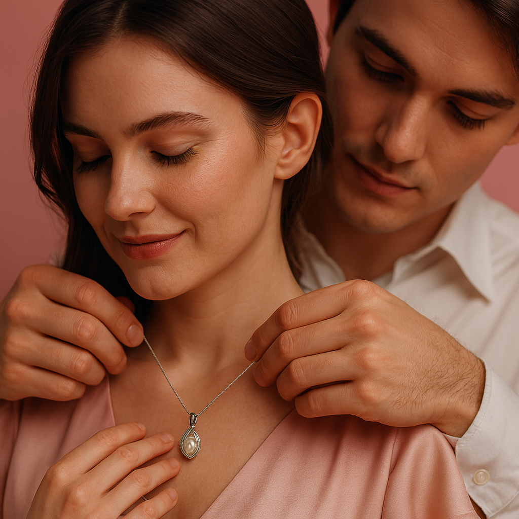 Set against moments of closeness, this freshwater cultured pearl pendant rests gracefully in a silver-tone setting, reflecting warmth, intimacy, and timeless elegance. Designed to accompany meaningful evenings and lasting connections, it is a subtle statement of love, crafted for modern romance.