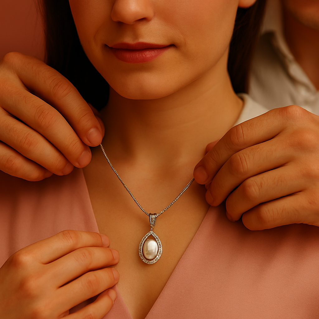 A refined pearl pendant designed to rest where emotion lives — timeless, intimate, and effortlessly elegant.